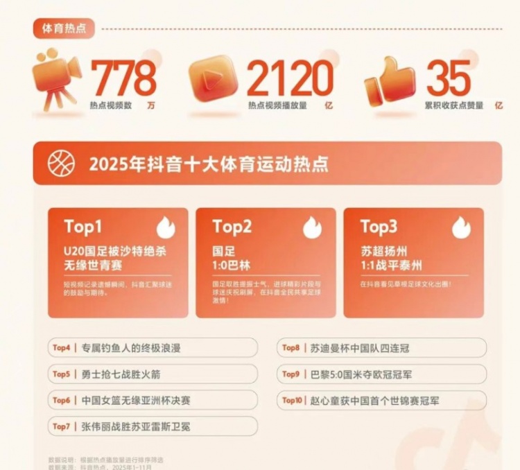 2025抖音十大体育热点:火勇抢七&中国女篮无缘亚洲杯决赛上榜